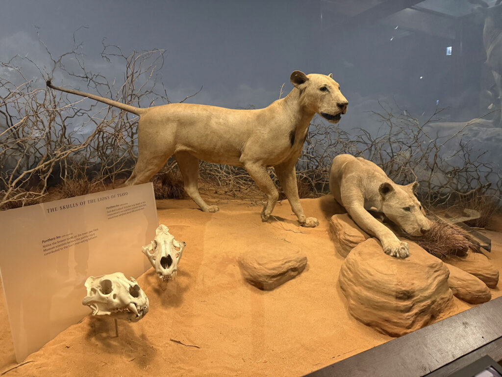 If you’ve read the famous 1907 book, The Man-Eaters of Tsavo, or seen the 1996 movie starring Val Kilmer called The Ghost and the Darkness, then you’re familiar with the story of the Tsavo lions. If you don’t know their story, I’ll give you a brief synopsis. For over nine months in 1898 these two siblings terrorized workers building a railroad bridge in the the Tsavo area of what is now known as Kenya. It is thought that they killed and ate about 28 of the railroad workers, but no one knows for sure how many people these lions killed over their lifetime. The head engineer, Lt. Col. John Henry Patterson, eventually killed the lions. He sent their skulls and hides to his home in England and they were turned into rugs. In 1925 he sold the rugs to the Field Museum, who then turned them back into taxidermied lions.