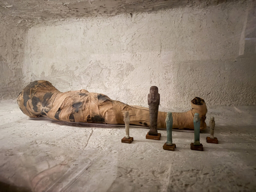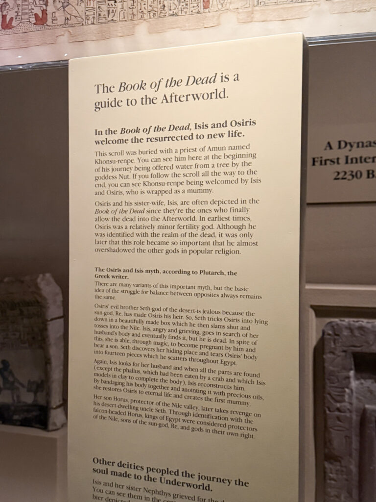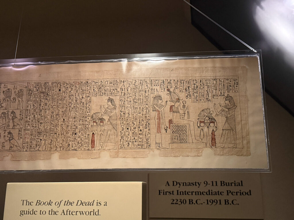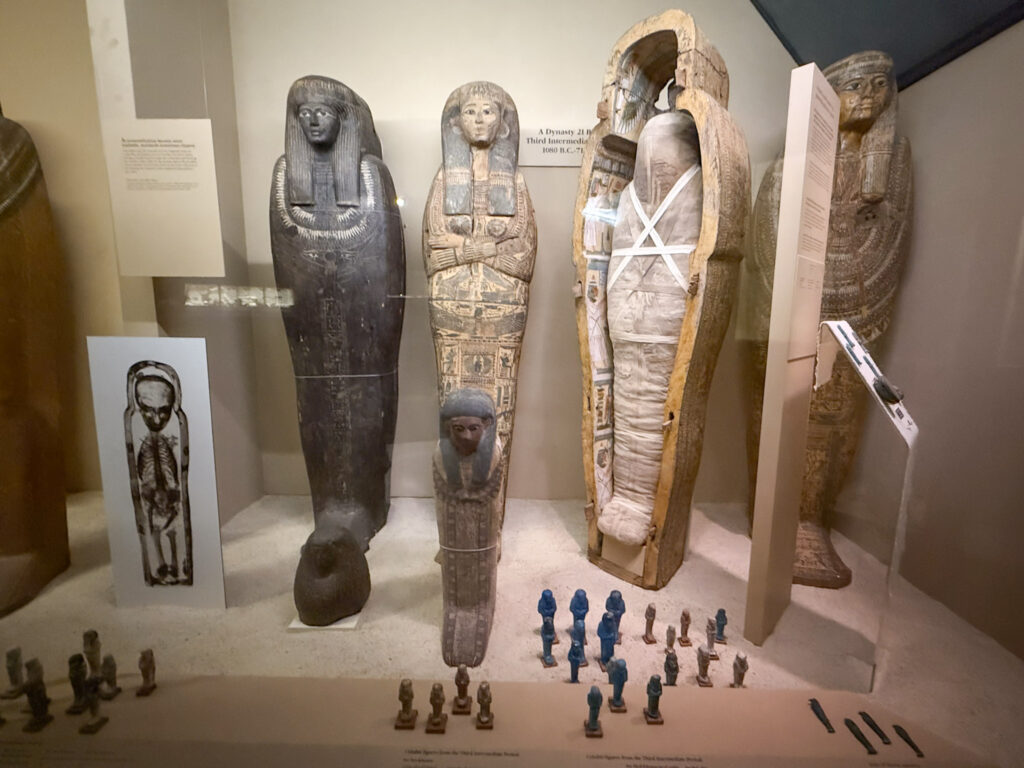 My last stop of the day before I had to head back to work was the Ancient Egypt exhibit. This is a really cool exhibit that make you feel like you are exploring an Egyptian pyramid. The downside to this exhibit is it is on two floors with a narrow steep stairway connecting them, so those with small children or mobility issues will have difficulty navigating it. However, that’s also the cool thing about it because it makes you feel like you are descending into an actual pyramid. There are 23 human mummies and many mummified animals on display here. Two authentic chamber rooms from the burial site of pharaoh Unis-Ankh are on display, complete with hieroglyphics. It was super cool to see, but photography was difficult due to the low-lighting and cramped spaces.